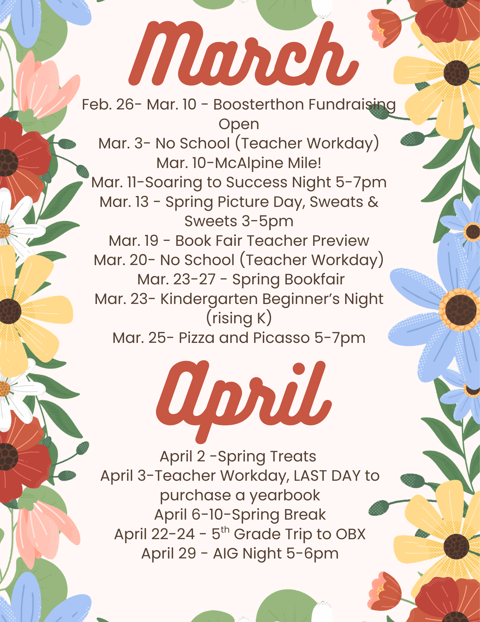 Spring Treats will be arranged by each classroom's Room Parent. No family attendance.